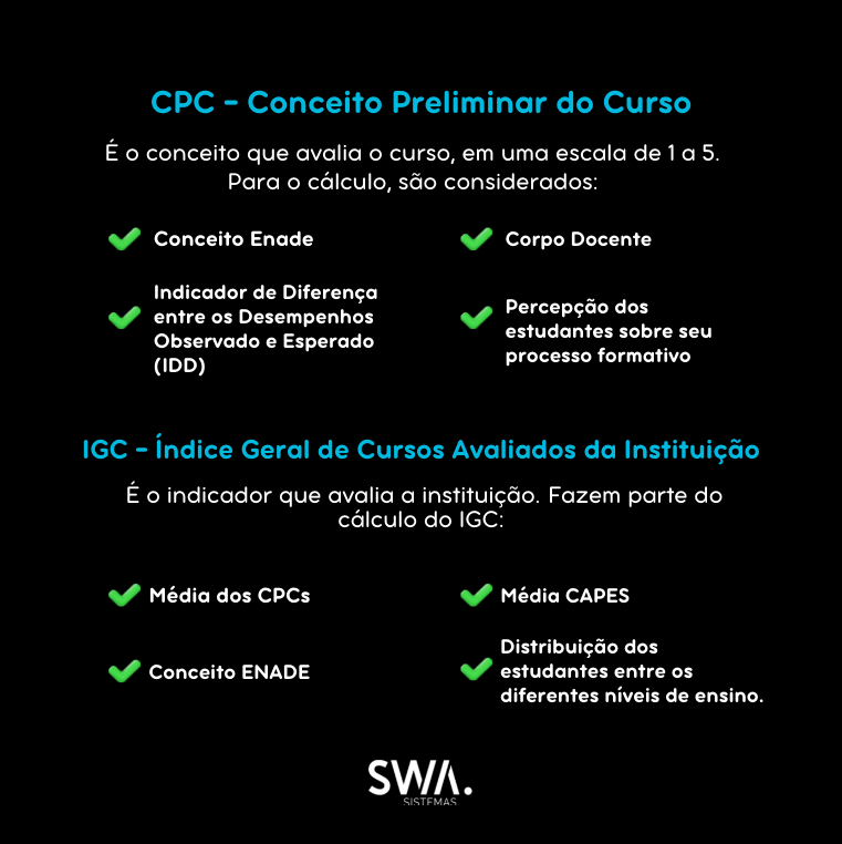 Além de contribuir para a medir o nível de aprendizado dos estudantes nas Instituições, o exame ajuda a compor outros dois índices do Ministério da Educação: o Conceito Preliminar do Curso (CPC) e o Índice Geral de Cursos Avaliados da Instituição (IGC). Os conceitos considerados para cálculo são:enade